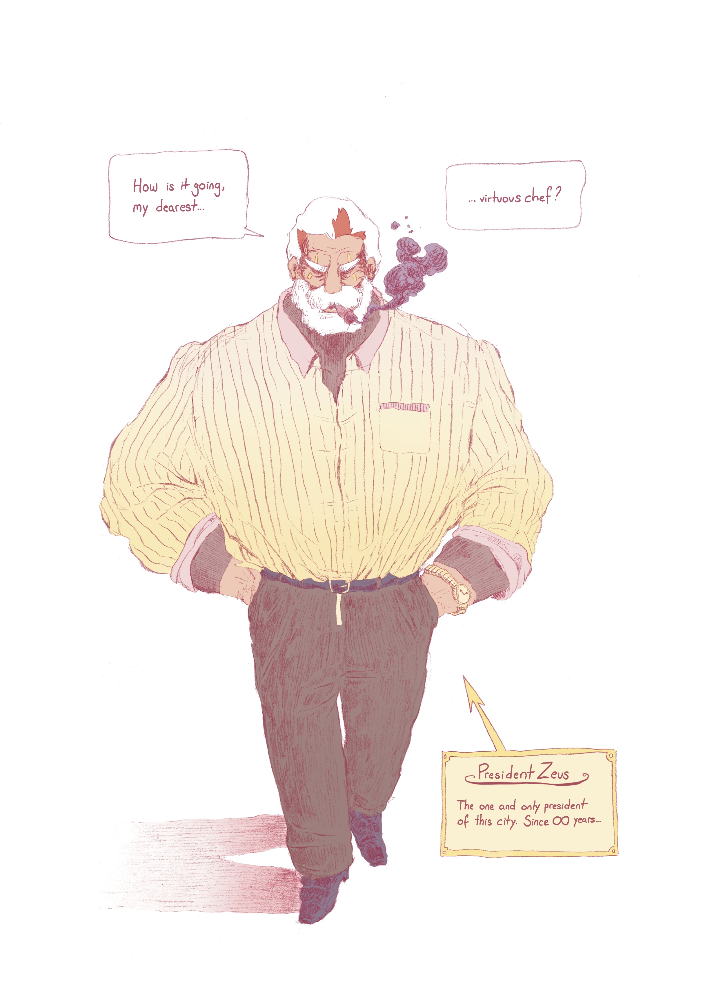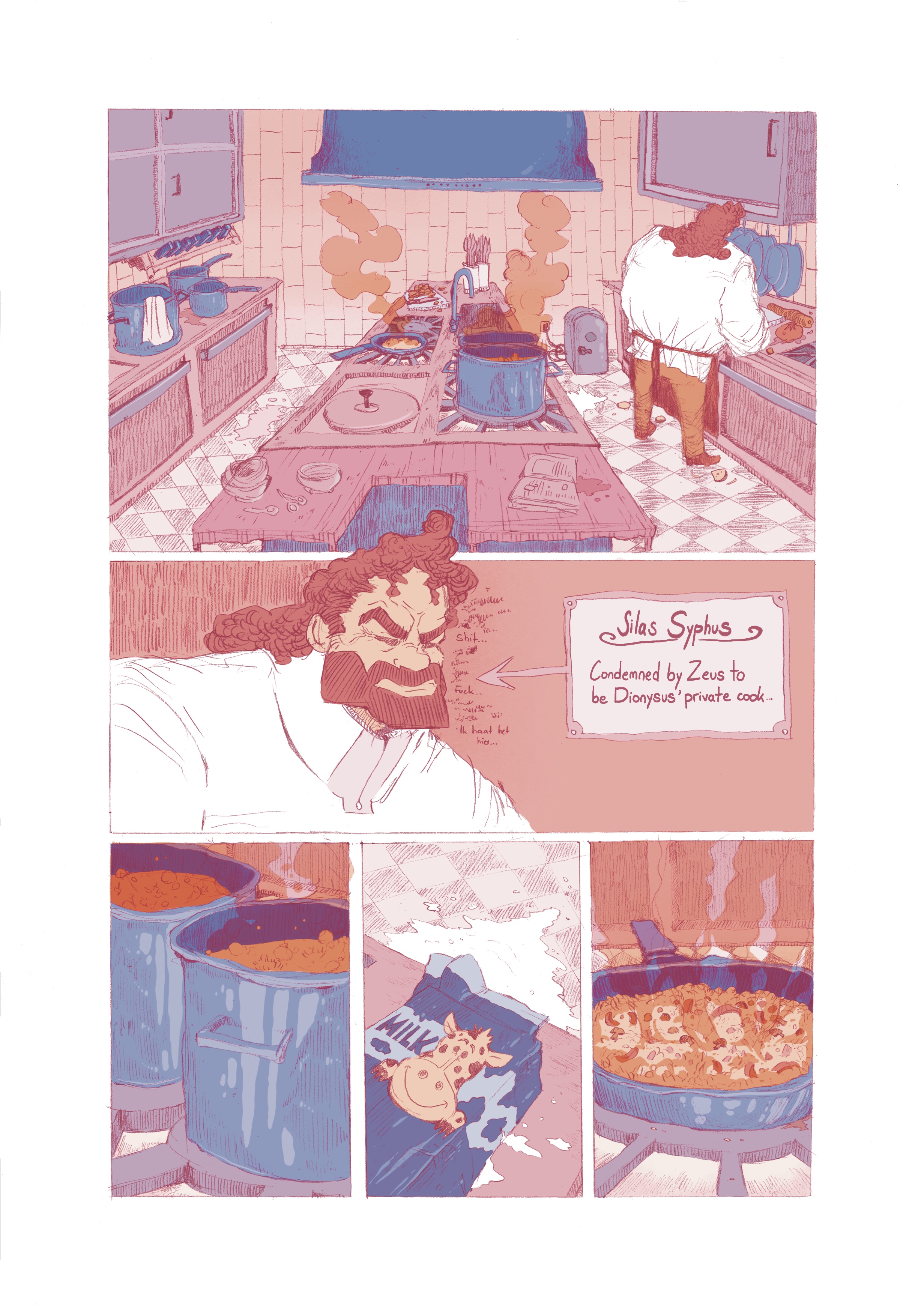 Silas Syphus is condemned by Zeus to be his son’s personal cook. Henceforth, Silas has to cook, make the dishes, cook, make the dishes for all eternity. This is not a story about breaking free from your oppressor, nor is it a story about vengeance, it is a story about accepting your circumstances and actually finding joy in new challenges.