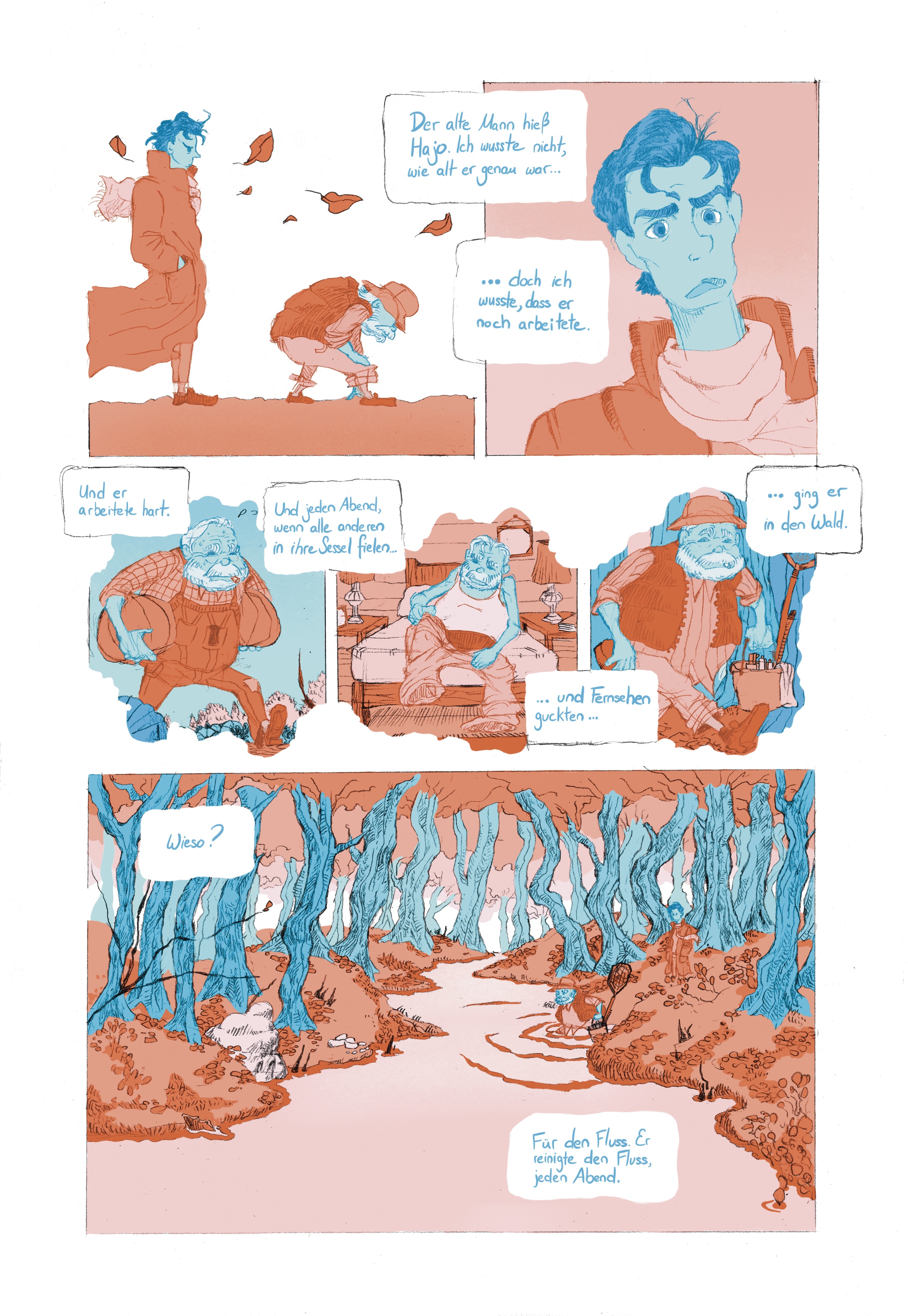 The (almost) true story, how I met an old man, who would clean up rivers as a hobby. Our topic was environmentalism, which inspired me to tell this small story, induced with a little magical realism in style of Studio Ghibli’s famous works.